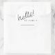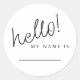 Simple black and white name sticker featuring casual script that says "hello! MY NAME IS." Use it for social gatherings and parties.