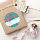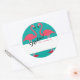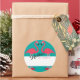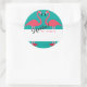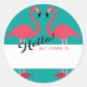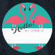 Hello name tag for event with two pink flamingos facing each other. Fun fonts, pink on teal background, and the text "Hello My Name Is". Guests can write in their name on the white space. Fun and funny for tropical themed event, luau, tiki party, reunion or any event with a touch of the whimsical.