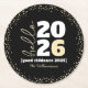 “Hello 2026. Good riddance 2025.” Sometimes, the new year can’t come quickly enough. And this is one of those years. A playful visual of modern, bold, white, graphic block typography and faux gold glitter elegant script calligraphy and dots over black, help you usher in the New Year. Feel the warmth and joy of the holiday season whenever you relax with your favourite beverage on this stylish and modern personalized name and year paper party coaster. Choose from various shapes. Matching and coordinating cards, envelopes, stickers, giftwrap, plates and other products are also available. Makes a fun and festive addition to your party!