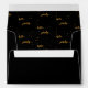 Outside: black background colour. Back: template for a name and address. Inside: Black background and faux gold text written with a trendy hand-lettered style script: hello seventy. With golden dots as decor. A simple and trendy envelope for your 70th birthday party invitations, save the dates or thank you cards,