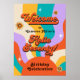 Welcome your party guests to step back in time to the groovy era of the 1970s as you celebrate the guest of honour's 70th birthday in true retro style. Get ready to relive the peace, love, and freedom of the hippie movement with a groovy party that's sure to transport everyone to a time of flower power and disco balls. Encourage your guests to dress up in their best hippie-inspired attire, from bell-bottoms and fringe vests to headbands and platform shoes. This party welcome sign design has a bold colourful sunburst with wavy rays emitting in the background. A groovy seventies font spells out your welcoming text in the style of that bygone era. Personalize the text template with the Guest of Honour's name. Note: This poster design can be downloaded and you can have it printed on your chosen type of poster board or sign material.