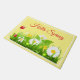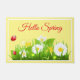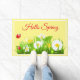 Doormat is shown with a light-yellow colour background and white border with a hello spring text and a lovely flowers print.
