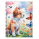 Watercolor painting of an adorable dog surrounded by flowers and butterflies.