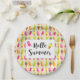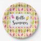 Paper plates with an image of a summertime pattern of popsicles and ice cream in watercolors. Hello Summer written in a fun trendy font.