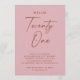 This 21st birthday invitation features a soft dusty rose pink background paired with elegant handwritten “Twenty One” script and clean uppercase text. The gentle muted pink tone gives the design a warm, modern feel, perfect for creating an inviting and stylish atmosphere for the celebration. All event details - including the name, date, time, location, and RSVP information - can be fully customized to match your celebration. The mix of script and minimal typography creates a refined look that suits a variety of party styles, from relaxed gatherings to more polished milestone events. This invitation works well with neutral decor, blush palettes, minimalist styling, and modern birthday setups. It looks great in both printed and digital formats.