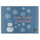A Slice of Life and Delight presents Hello, Winter Wonderland decorative glass cutting board. The snowman is decorated with white snowflakes, pink writing, and a blue backdrop. The snowman also has a blue hat and scarf.
