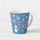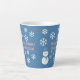 A Slice of Life and Delight presents a Hello, Winter Wonderland latte mug featuring a snowman decorated with white snowflakes, pink writing, and a blue backdrop. The snowman latte mug also features a blue hat and scarf.
