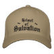 Fits well due to elastic edging, not adjustable. Good qualty material. Good quality embroidering. Subtle lettering (white on beige) just as my wife likes.