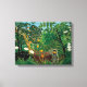 Henri Rousseau Exotic Landscape canvas print. Oil painting on canvas from 1910. French painter Henri Rousseau fell in love with tropical scenes during his world travels. Exotic landscape is one of his famous primitivist jungle paintings feauturing monkeys playing in the forest. Two monkeys hang from an orange tree knocking fruit down to their friends below, while a larger monkey snacks on an orange nearby. The tropical foliage is rich, dense, and green, featuring white lilies and other tropical flowers. A pretty gift for fans of Henri Rousseau, jungle paintings, tropical landscapes, primitivism, and French art.