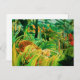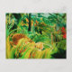Henri Rousseau Tiger dans une carte postale tempête tropicale. Peinture à l'huile sur toile de 1891. L’une des plus grandes oeuvres du post-impressionnisme et l’une des peintures les plus célèbres d’Henri Rousseau, Tiger in a Tropical Storm, représente un tigre surpris mis au défi par le vent et la pluie féroces de la jungle. L’oeuvre est réputée pour son utilisation charmante mais complexe de la faune multicolore. Jaunes clairs, verts foncés, rouges sauvages et bleus doux en font un travail chromatiquement dynamique, et le tigre lui-même est incroyablement imaginé. Un beau cadeau pour les amateurs d'Henri Rousseau, de post-impressionnisme, de peintures de tigres et d'art français.