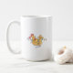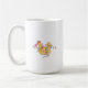 The watercolor art of Chris Thompson on a mug! Little buff hen tangled in Christmas lights carries an ornament in her beak. She's ready to decorate!