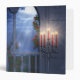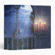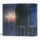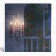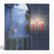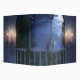 Standing on a candlelit balcony at night, looking out on red roses and a willow tree growing on the grassy bank of a lake. The bright rays of the silver moon stream through the window arches.