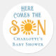 This cute sunshine-themed baby shower sticker features a watercolor yellow sun and "Here comes the Son" in stylish retro blue typography. Perfect for a boy's baby shower.