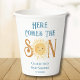 These baby shower paper cups feature the text "Here Comes The Son" in blue retro typography with a cute yellow watercolor sun.