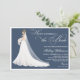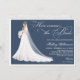 Here comes the bride bridal shower invitation features gorgeous glam but modest bride-to-be in wedding gown. Back of invite features dainty lace pattern. Multiple colour options in addition to customizing bride’s hair style, colour and skin tone.