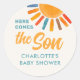 This sun-themed baby shower sticker is decorated with a colourful sun and stylish typography on a cream background. The text is customizable. Original Watercolor © Michele Davies.