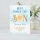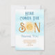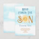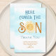 This cute boy's baby shower thank you card features the text "Here Comes The Son" in stylish blue and brown typography with a yellow watercolor sun, clouds, and blue sky. Easily customizable. Original Watercolor © Michele Davies.