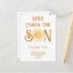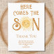 This fun boy's baby shower thank you postcard features the text "Here Comes The Son" in brown retro typography with a cute smiling yellow watercolor sun. Easily customizable. Original Watercolor © Michele Davies.