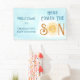 This cute boy's baby shower banner features the text "Here Comes The Son" in blue retro typography with a smiling yellow watercolor sun on a clouds and sky background. Easily customizable. Because we create our artwork you won't find this exact image from other designers. Original Watercolor © Michele Davies.