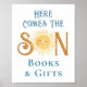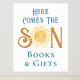 This Books And Gifts Baby Shower Sign features a yellow watercolor smiling sun and stylish script typography. Original Watercolor © Michele Davies.