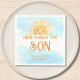 This sun-themed baby shower paper napkin is decorated with a watercolor smiling sun and stylish typography on a blue sky background.