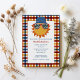 Celebrate moms-to-be with these fun baby boy Here Comes the Sun themed shower invitations. They have a fun illustration of a cartoon sun wearing sunglasses and a bucket hat in yellow, orange, red and blue along with a coordinating plaid pattern. These invites are ready to be customized with all of your party details.
