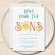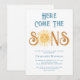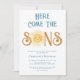 It features the text "Here Come The Sons" in blue retro typography with a cute yellow watercolor sun.