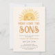Famille Invitation et amis à votre baby shower jumeau sur le thème du soleil avec cette invitation de baby shower soleil mignon. Il présente le texte "Here Come The Sons" en typographie élégante avec un joli soleil d'aquarelle jaune sur un arrière - plan crème douce. Le dos est décoré d'un motif souriant. Facile à personnaliser. Aquarelle originale © Michele Davies.
