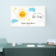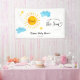 Whimsical baby shower welcome banner featuring illustration of a sun with cloud and stars. The text says "Here Comes The Sun."