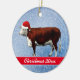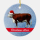 A Hereford cow is wearing a Santa hat on a background of snow. This design is perfect for the Hereford breeder.