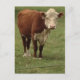 Green pastures and healthy Hereford cow make a great way to send greetings or reminders. Country style farm photo.