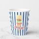 This fun paper cup design starts with a blue and white striped background. On the front and back, it a sugar ice cream cone with four scoops of ice cream. The text on the pink banner reads "here's the scoop", which can be customized.