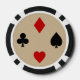 Spanish surname Hernandez historical arms set on a mottled parchment style background. The reverse of the chip has the symbols for the four suits of cards; a black spade, a red heart, a red diamond, and a black club on the same parchment style background.