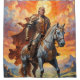A valiant Trump clad in resplendent golden armour rides a majestic white horse against a breathtaking backdrop of a vibrant, sunlit sky. The knight's flowing red cape and the horse's powerful stance evoke a sense of heroism and grandeur. The dramatic clouds and the radiant sun create a striking contrast, enhancing the epic and timeless feel of the scene. This image captures the essence of medieval chivalry and adventure, making it a captivating visual for enthusiasts of fantasy and historical themes.