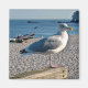 Closeup herring gull (Larus argentatus) perched on a wooden fence and the pebble beach of Etretat in Normandy in France