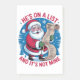 A fun, festive, and colorful cartoon illustration of Santa Claus happily holding a long, rolled-up "Naughty/Nice List." The background is a vibrant blue with white snowflakes and evergreen trees, enclosed by a circular border. Bold, red and white text prominently features the phrase: "HE'S ON A LIST AND IT'S NOT MINE." This design has a distinct, appealing retro or vintage feel, perfect for holiday apparel or greeting cards.