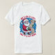 A fun, festive, and colorful cartoon illustration of Santa Claus happily holding a long, rolled-up "Naughty/Nice List." The background is a vibrant blue with white snowflakes and evergreen trees, enclosed by a circular border. Bold, red and white text prominently features the phrase: "HE'S ON A LIST AND IT'S NOT MINE." This design has a distinct, appealing retro or vintage feel, perfect for holiday apparel or greeting cards.
