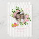 A delightful floral invitation with a hexagon photo frame and clusters of pink flowers with green foliage embellished with three Easter eggs.