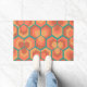 This doormat has a geometric design of hexagons in sets of three that look like flowers in gold, orange, and red on a field of teal.