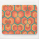 This mouse pad has a geometric design of hexagons in sets of three that look like flowers in gold, orange, and red on a field of teal.