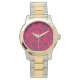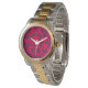 This watch has a geometric design of hexagons in sets of three that look like flowers in magenta and purple.