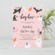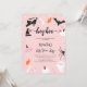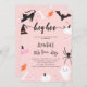 Cute halloween theme girl's birthday party invitation card featuring illustration of a ghost, black cat, spider, bat, candies, and pumpkins. The text says "hey boo."