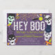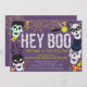Celebrate your little ghoul or goblin with this festive "Hey Boo" Halloween birthday invitation! Featuring a playful skeleton crew, colourful candies, spider webs, and a bold purple background, this design sets a spooktacular tone for a costume party.