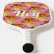 Pink watercolor geometric pattern pickleball paddle with “Hey” on the front. Easy to customize.