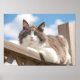 Hey You! - beautiful long haired diluted calico cat looking intently at the viewer from top of a wooden rail