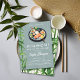 A modern, elegant, minimalist and simple birthday party invitation with a hibachi, Japanese dinner party theme. It features a modern watercolor illustration of a hibachi plate on a green background, framed by bamboo leaves, and simple, modern, white typography. On the back, a wild bamboo forest. A clean, minimalist, simple design for an elegant soiree of celebration.