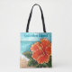 This 16" x 16" customized tote bag features a Becky Schultea original acrylic floral painting, "Hibiscus by the Beach" which includes a tropical orange hibiscus flower and greenery beside a tranquil beach setting with turquoise waves breaking against soft tan sand. You can add any text you like to make it personal, or you can choose to leave the text off completely. This tote will be your go to Summer bag, from the pool to the beach to a cruise vacation, or to the market, gardening centre, a trip to the gym, or carrying your essentials just about anywhere. It would also make a wonderful personalized gift for anyone who loves all things tropical and beachy!