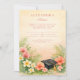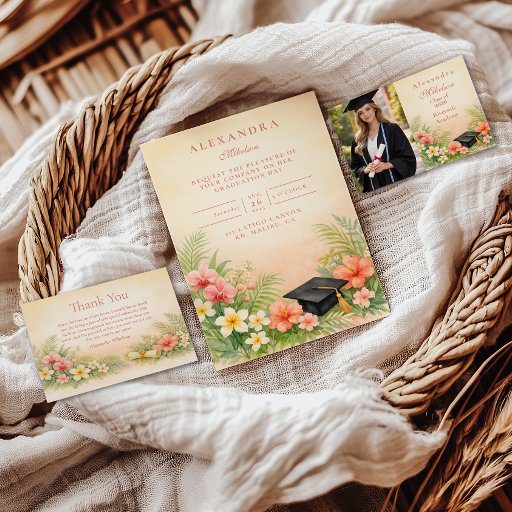 A soft parchment backdrop is framed by lush tropical greenery and coral hibiscus blooms, creating a fresh yet elegant celebration aesthetic. Delicate plumeria accents and airy palm leaves bring a warm, destination-inspired feel, while the classic typography keeps the layout refined and timeless. A subtle graduation cap detail grounds the design with just the right academic touch.