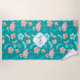 A pretty aqua teal and pink flamingo and hibiscus flower pattern is the feature on this tropical themed beach towel. At the centre is an ornate white banner with your monogram in matching pink and your name in teal script over it. Everything is placed on a darker teal background.