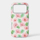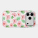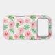 Un joli coque iphone d'hibiscus rose tropical. Cette coque iphone à thème d'été présente des fleurs d'hibiscus peintes à la main, des feuilles de monstère sur un arrière - plan crème avec rayures blanches.